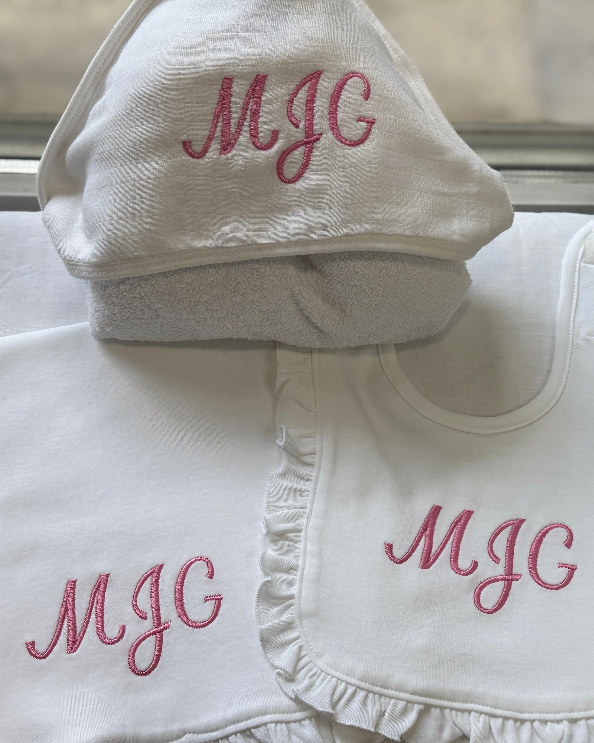 Custom baby girl pink gift set. Can include baby bib, baby burp cloth, towel, pink blanket and teddy bear!